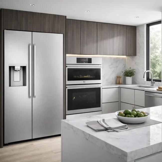 Combo cuisine LG inox – réfrigérateur côte-à-côte et cuisinière encastrée – LL27T3530S & WCES6428F