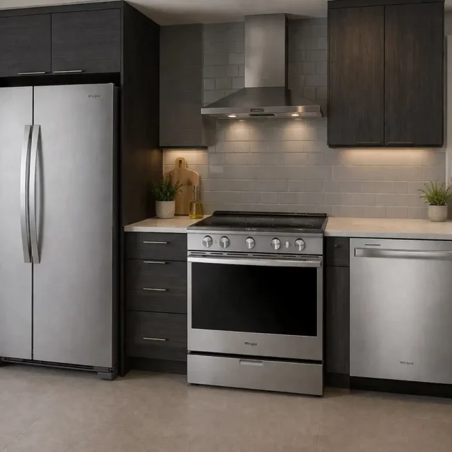 Whirlpool stainless steel kitchen set - side-by-side refrigerator, stove and dishwasher - WRS312SNHM + YWEEA25H0HZ + WDT540HAMZ