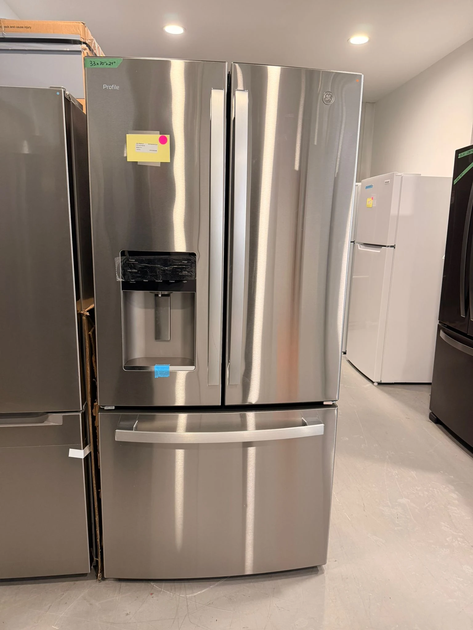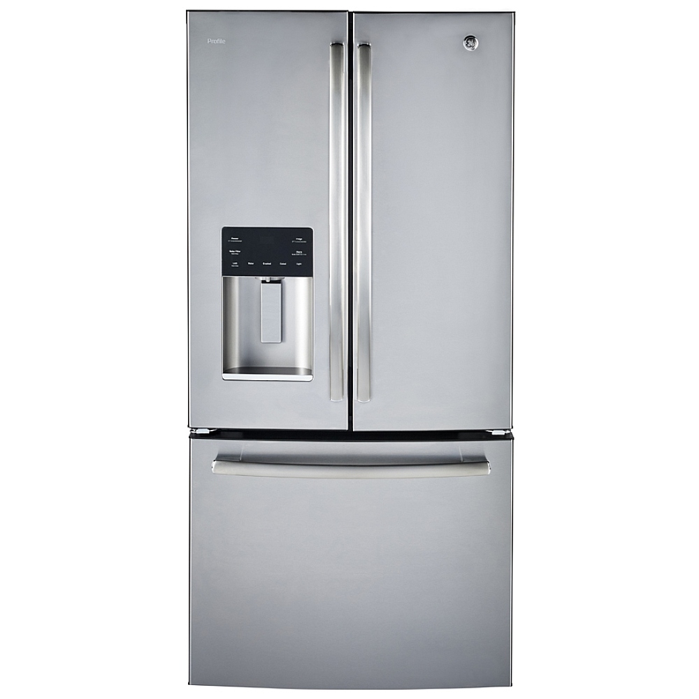 The GE Profile PYE18HYRKFS French-door refrigerator offers a total capacity of 17.5 cu. ft. in a 33-inch counter-depth format, perfectly suited to modern kitchens seeking elegant, compact integration. Its counter-depth design allows harmonious alignment with cabinetry, while maintaining efficient interior organization. It features an external water dispenser and through-the-door ice dispenser, offering convenient access to cold drinks on a daily basis. Its stainless steel finish adds a contemporary, durable touch.