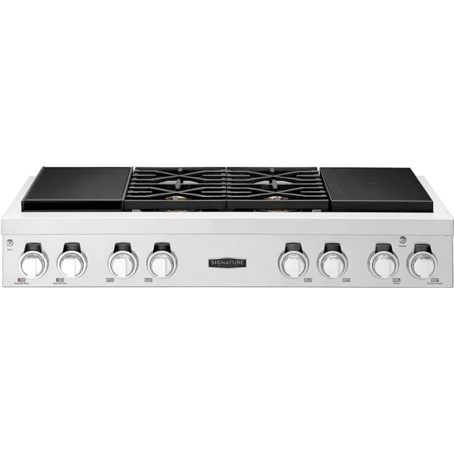 La surface de cuisson est équipée de six brûleurs au gaz permettant une gestion précise de la chaleur pour toutes les méthodes de cuisson, des saisies rapides aux préparations délicates. Cette configuration assure une flexibilité maximale au quotidien.