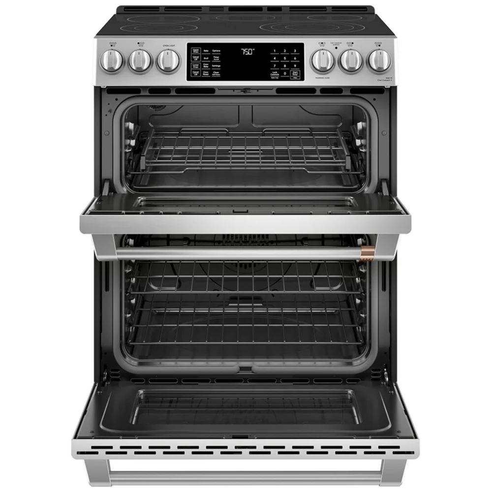 La cuisinière électrique Café CCES750P2MS1 30 pouces offre une grande capacité de 6.7 pi³ et une conception haut de gamme idéale pour les cuisines modernes. Cette cuisinière Café est équipée d’un four double pratique, de la convection véritable et de cinq brûleurs puissants. De plus, son système autonettoyant et ses grilles autonettoyantes facilitent l’entretien au quotidien.