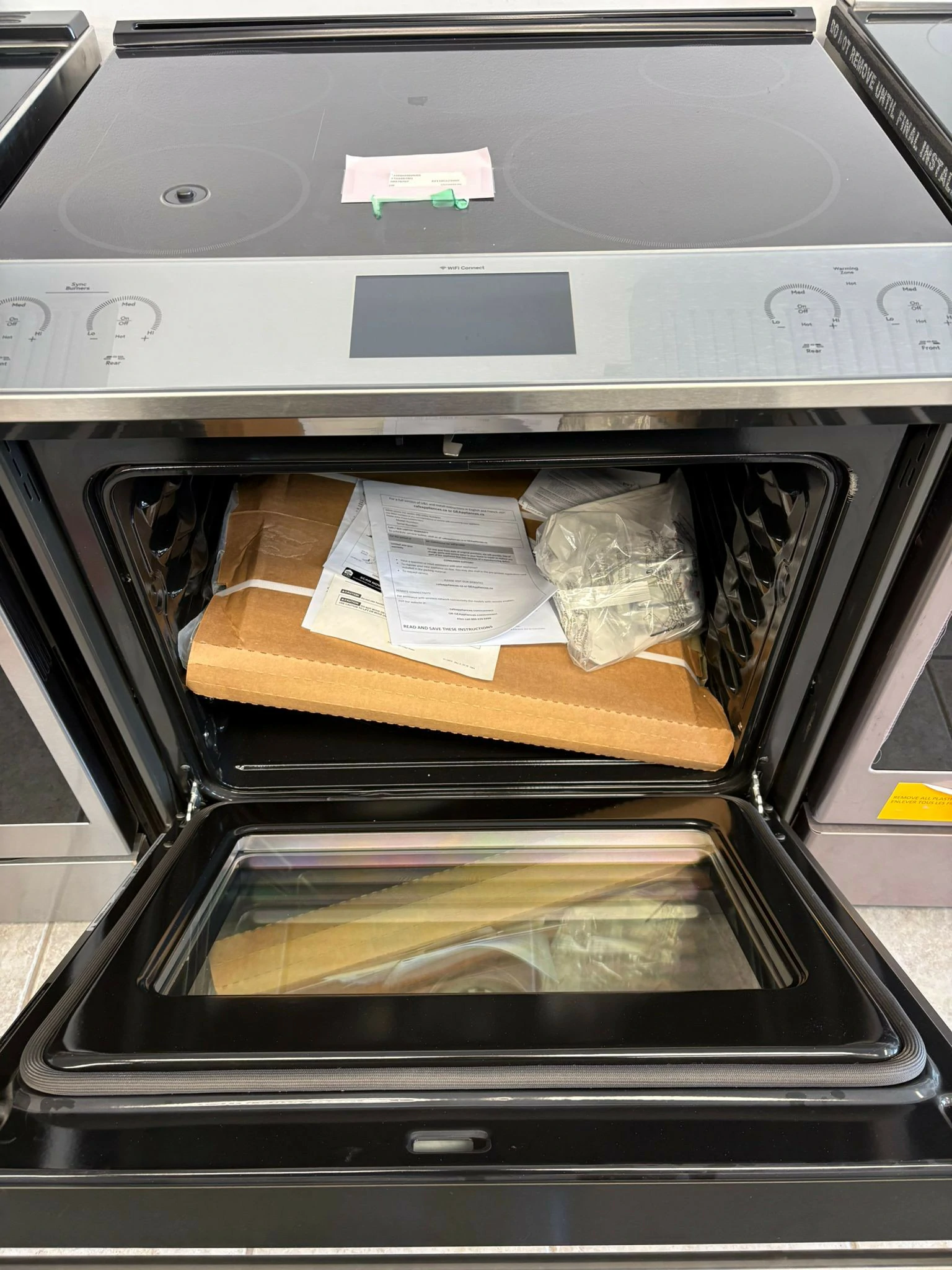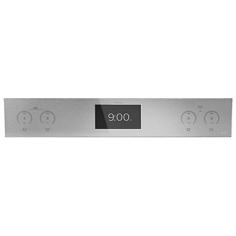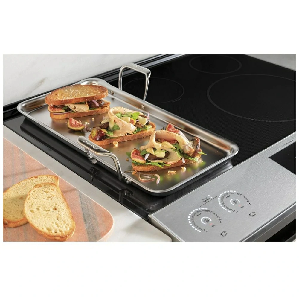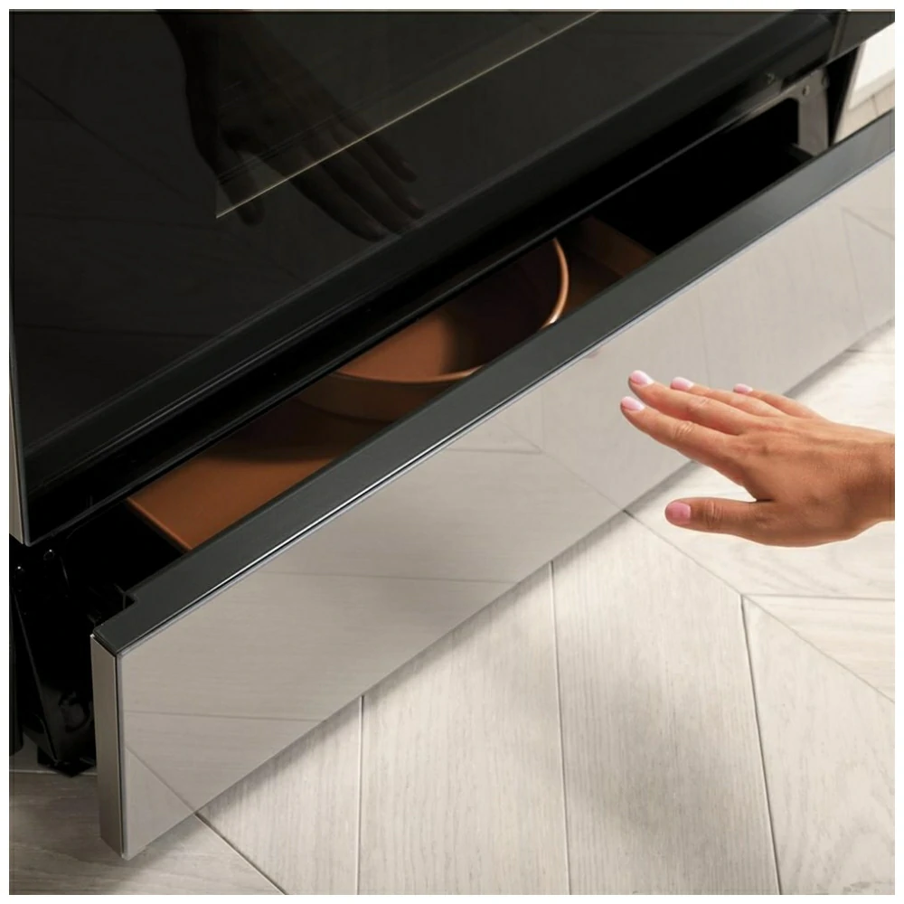 La cuisinière comprend un tiroir réchaud (warming drawer). Ainsi, les plats peuvent rester à température avant le service. De plus, la finition platine GE Café apporte une apparence élégante et distinctive dans la cuisine.