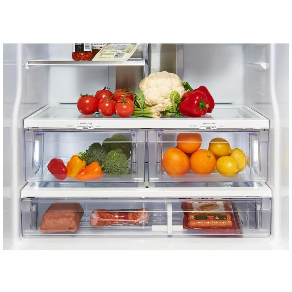 Ce modèle propose une capacité totale de 24,8 pi. cu. Ainsi, vous rangez plus d’aliments sans effort. De plus, vous ajustez les tablettes selon vos besoins. Ensuite, vous organisez les contenants pour garder une bonne visibilité. Enfin, le congélateur inférieur facilite l’accès aux surgelés.