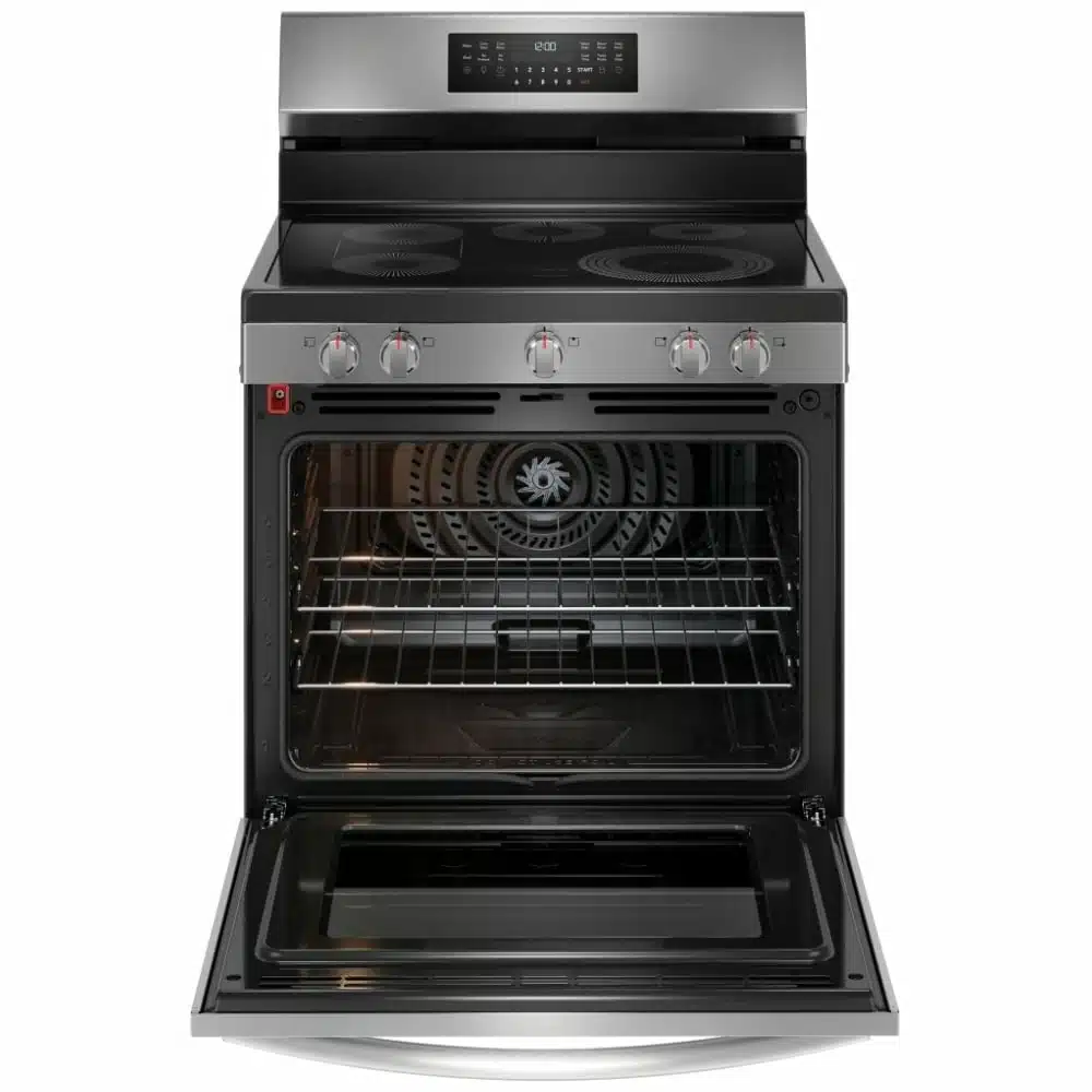 La cuisinière électrique FRIGIDAIRE GALLERY GCRE306CBF de 30 pouces offre une capacité généreuse de 5.3 pi³, idéale pour cuisiner au quotidien ou recevoir. Sa finition inox donne un style moderne et s’agence facilement à plusieurs cuisines. Avec la convection, cinq éléments de cuisson, le tiroir de rangement, la fonction air fry et l’autonettoyage, elle propose une utilisation polyvalente et simple.